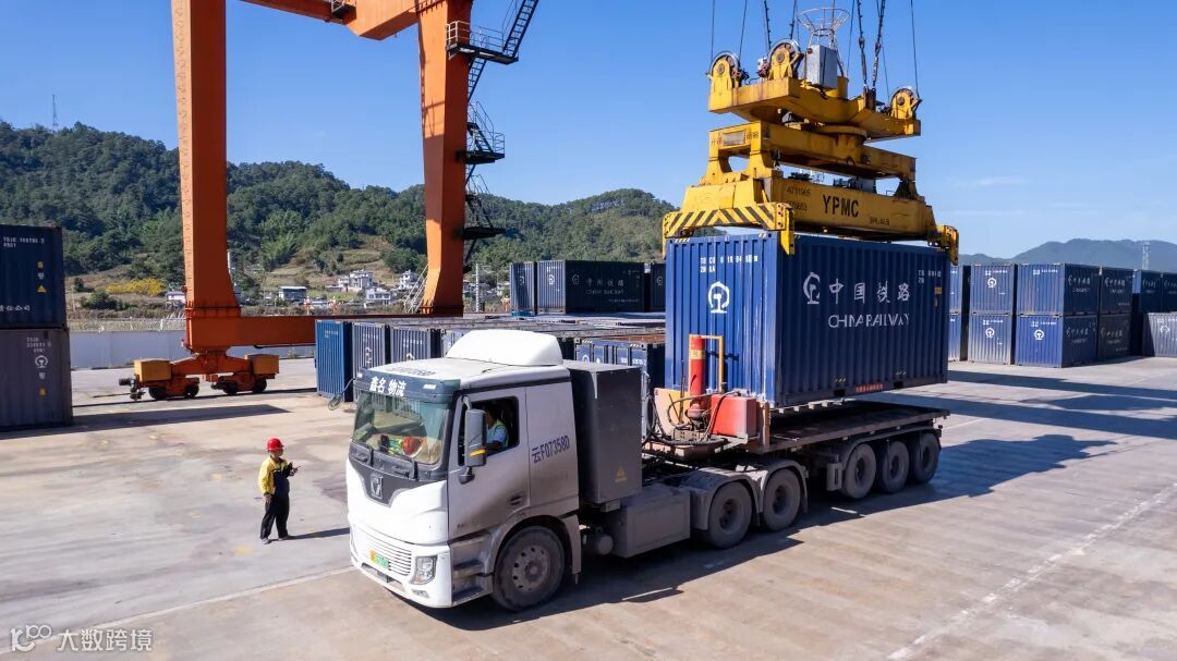 2025年12月2日,中老铁路宁洱站货场的工人在指挥龙门吊装卸铁路集装箱。(新华社)