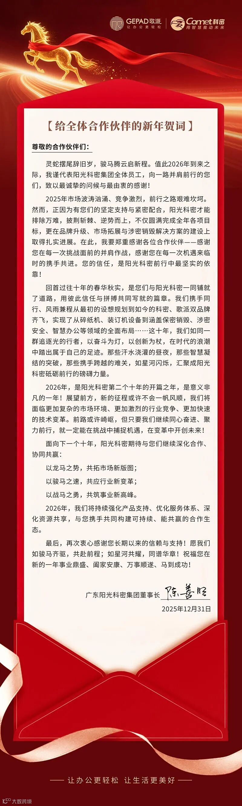 致全体合作伙伴:阳光科密董事长2026新年贺词