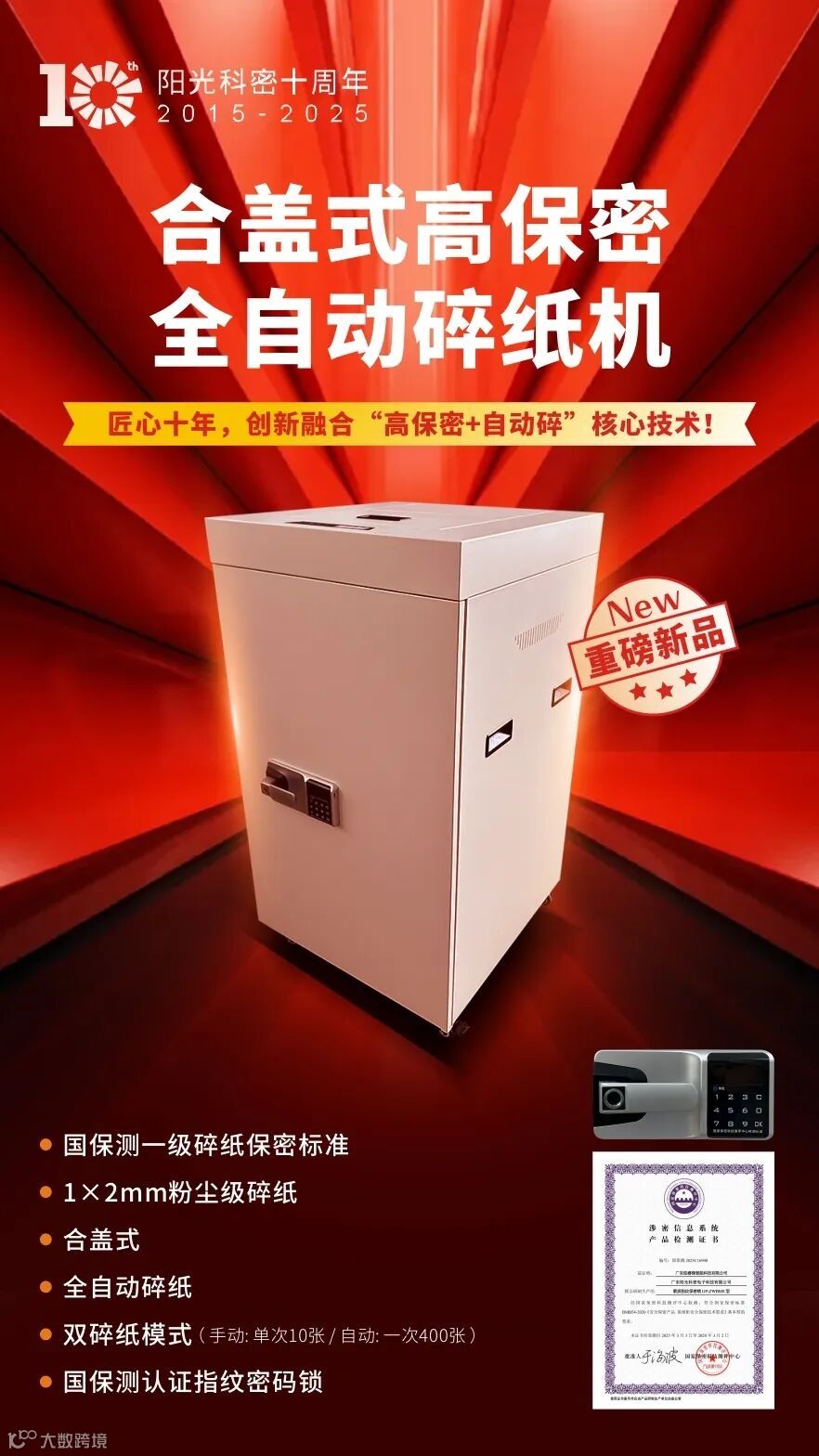 2025年,是阳光科密的十周年。值此重要时刻,阳光科密重磅推出合盖式高保密全自动碎纸机!这款新品,是行业第一次将国保测认证的高保密与合盖式自动碎完美结合,将开启高保密自动碎纸新时代!