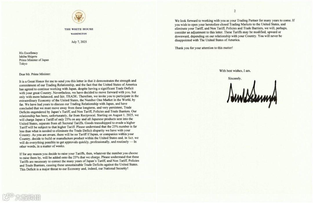7月7日,日本成为首批收到美方通知的国家,信中称“美日关系远非对等”,并宣布将对日本输美商品单方面加征25%的关税。《日经亚洲》评论称,这封信粉碎了日本对两国间“特殊关系”的幻想。