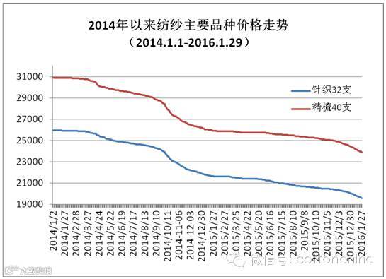 1月份,纱线市场价格延续弱势,行情阴跌不止,纱厂普遍资金紧张,对原料的采购积极性不高,皮棉成交量小。月底,由于春节临近的原因,多数纺织企业进入年前收尾工作,市场观望心态占据主导。