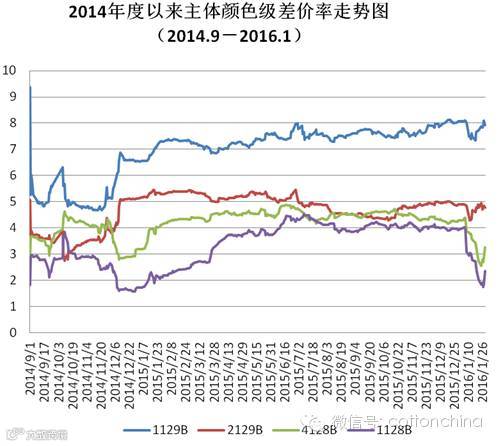 1月份国内棉花现货价格等级差价趋于缩小,中低等级差价收窄明显,高中等级差价收窄幅度较小。以CC Index 3128B为标准级计算颜色级差价率,1月末1129B颜色级差价率为7.93%,较12月末缩小0.15%;2129B颜色级差价率为4.78%,同比缩小0.12%;4128B颜色级差价率为3.26%,同比缩小1.04%;1228B为2.37%,同比缩小1.59%;2227B颜色级差价率为6.46%,同比缩小1.69%。
