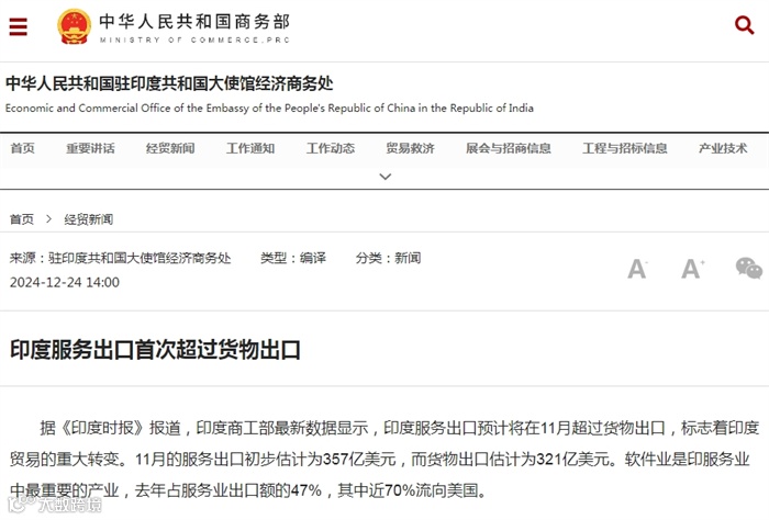 据《印度时报》报道,印度商工部最新数据显示,印度服务出口预计将在11月超过货物出口,标志着印度贸易的重大转变。11月的服务出口初步估计为357亿美元,而货物出口估计为321亿美元。软件业是印服务业中最重要的产业,去年占服务业出口额的47%,其中近70%流向美国。