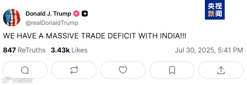 美国总统特朗普当地时间7月30日通过社交媒体宣布,将从8月1日起对印度输美商品征收25%的关税并实施其他“惩罚”。特朗普用大写的英语发文称:“我们与印度有着巨额的贸易逆差!!!”这对于自认是美国“朋友”的印度来说,多少有点“情何以堪”的意味。