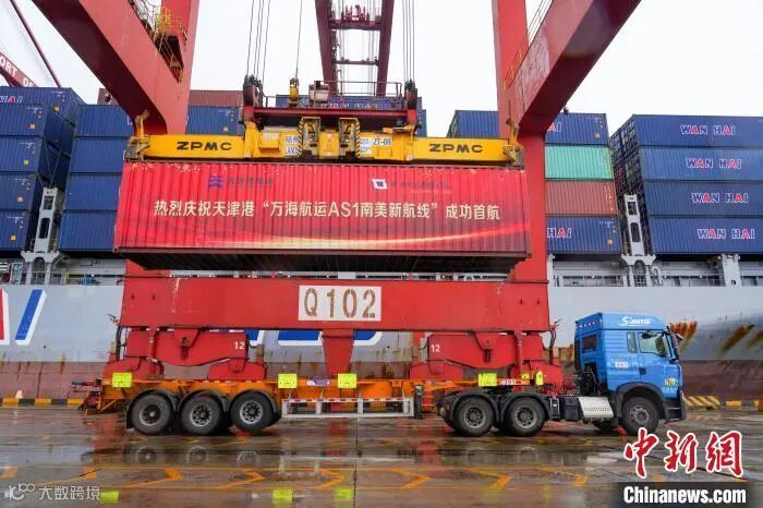 中新网天津7月29日电 (记者 王君妍)记者从天津港集团获悉,29日下午,万海航运“吉春”轮靠泊天津港集装箱码头,标志着万海航运直航南美新航线在天津港正式开通,进一步拓展天津港全球海运网络布局,强化航线枢纽能级,持续增强天津港“一带一路”海陆交汇点辐射带动作用。