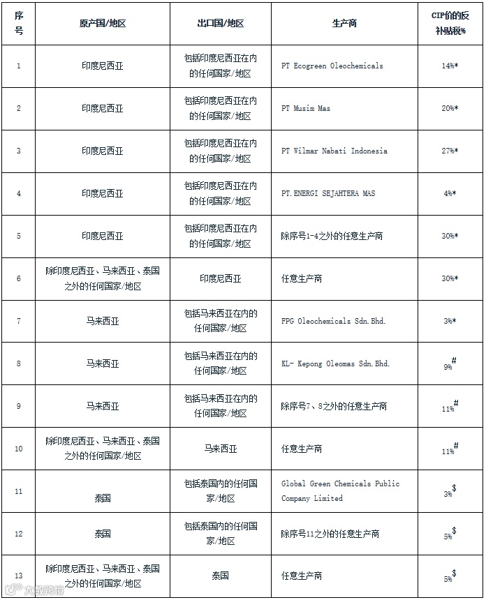 附表:印度对印度尼西亚等国饱和脂肪醇反补贴终裁结果