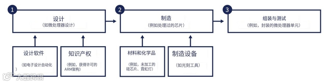 半导体价值链包括三个主要部分:芯片设计、制造(即芯片晶圆制造)、封装与测试。