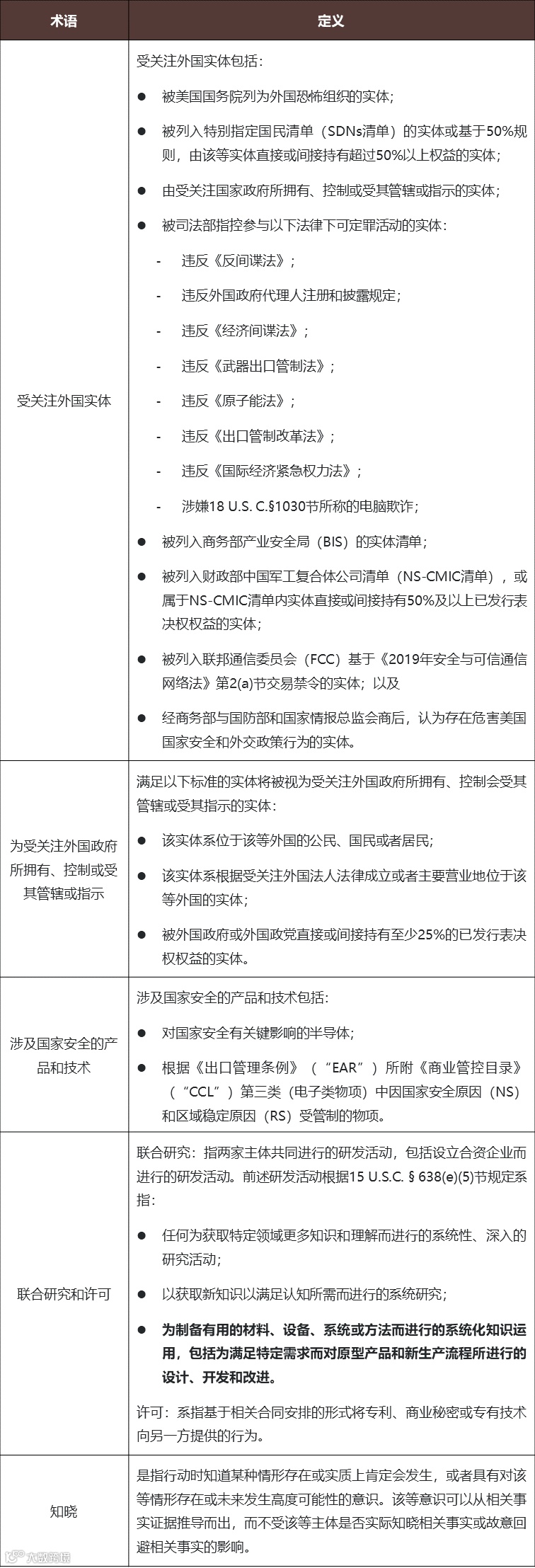 除上述以国别为基准的产能扩展限制外,在护栏细则中还以合作对象为基准设置了半导体相关研发和技术许可活动限制作为另一道护栏。任何受资助实体或其关联方均不得在知晓的情况下与受关注的外国实体进行任何涉及国家安全的技术或产品的联合研究或技术许可。护栏细则同样对于上述限制中的关键定义予以了列明: