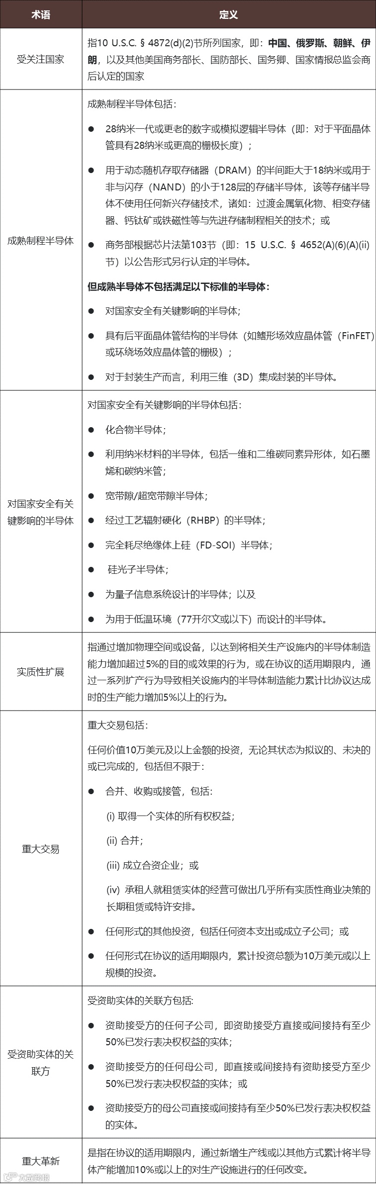 根据15 C.F.R § 231.202节的规定,任何根据芯片法获得补贴的受资助实体,其自身,及其关联方均不得参与任何涉及在受关注国家实质性扩展半导体产能的重大交易,包括对现有生产设施的重大革新。仅在以下情况下可予以豁免: