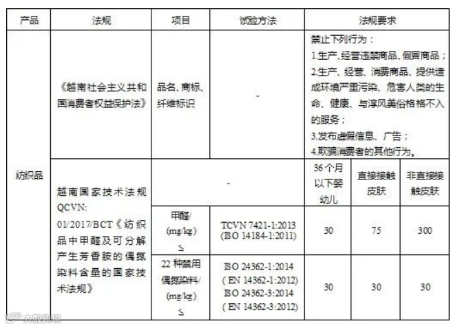 越南纺织服装技术法规为QCVN: 01/2017/BCT《纺织品中甲醛及可分解产生芳香胺的偶氮染料含量的国家技术法规》(法规颁布21/2017/TT-BCT⑪及后续修订07/2018/TT-BCT⑫、20/2018/TT-BCT⑬)。