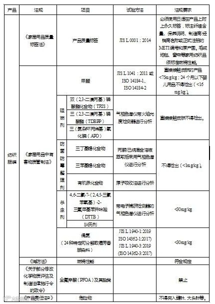 《家居用品中有害物质管制法》④及其实施条例⑤对纺织服装中有害物质进行管制,并列明有害物质名称、适用产品及试验方法,《家居用品中有害物质管制标准概要》⑥补充了限量要求。