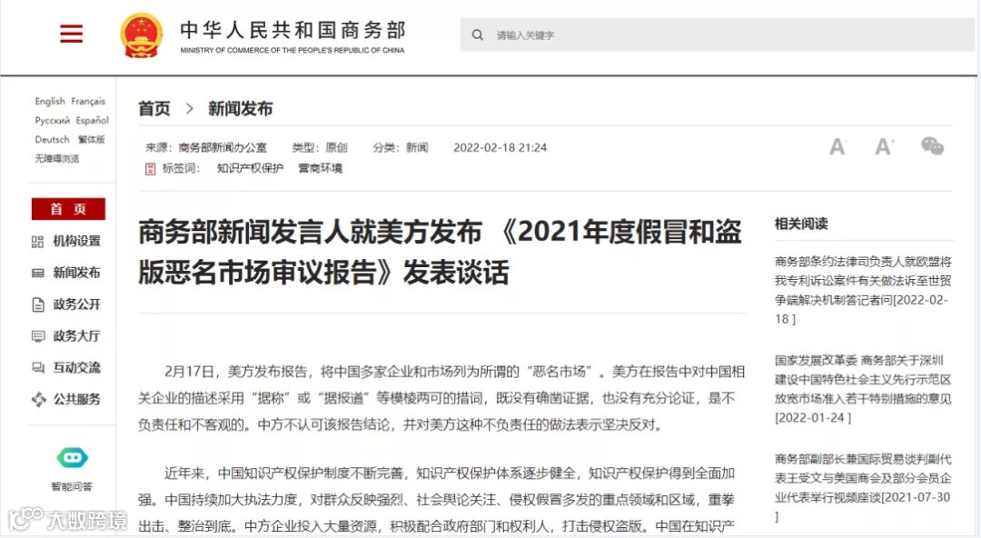 商务部新闻发言人就美方发布 《2021年度假冒和盗版恶名市场审议报告》发表谈话称,美方在报告中对中国相关企业的描述采用“据称”或“据报道”等模棱两可的措词,既没有确凿证据,也没有充分论证,是不负责任和不客观的。中方不认可该报告结论,并对美方这种不负责任的做法表示坚决反对。中方认为,美方应全面、客观反映中国政府和企业在知识产权保护方面所做的努力和取得的进展,并做出公正评价,避免对企业造成不应有的负面影响。中国愿同世界各国加强知识产权保护合作,为全球企业营造公平竞争的营商环境。