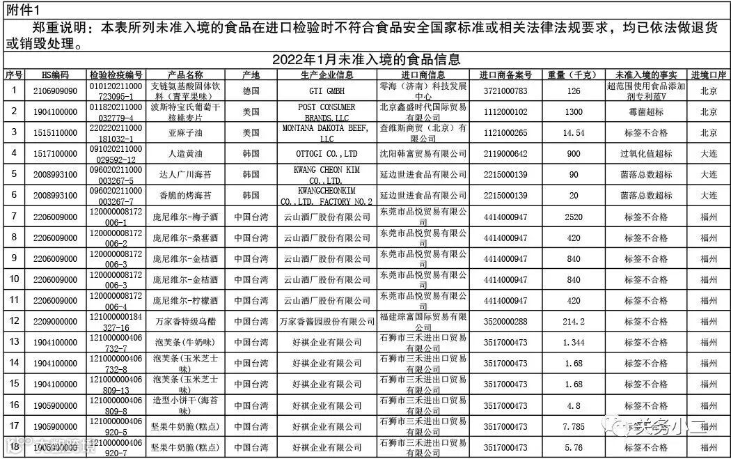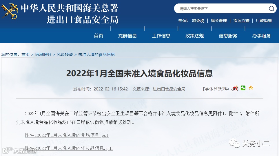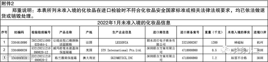 2022年2月16日,海关总署发布了《2022年1月全国未准入境食品化妆品信息》,据统计,2022年1月全国海关在口岸监管环节检出安全卫生项目不合格并未准入境食品化妆品共281批次,其中,未准入境食品278批次,化妆品3批次。未准入境食品化妆品均已在口岸依法做退运或销毁处理。