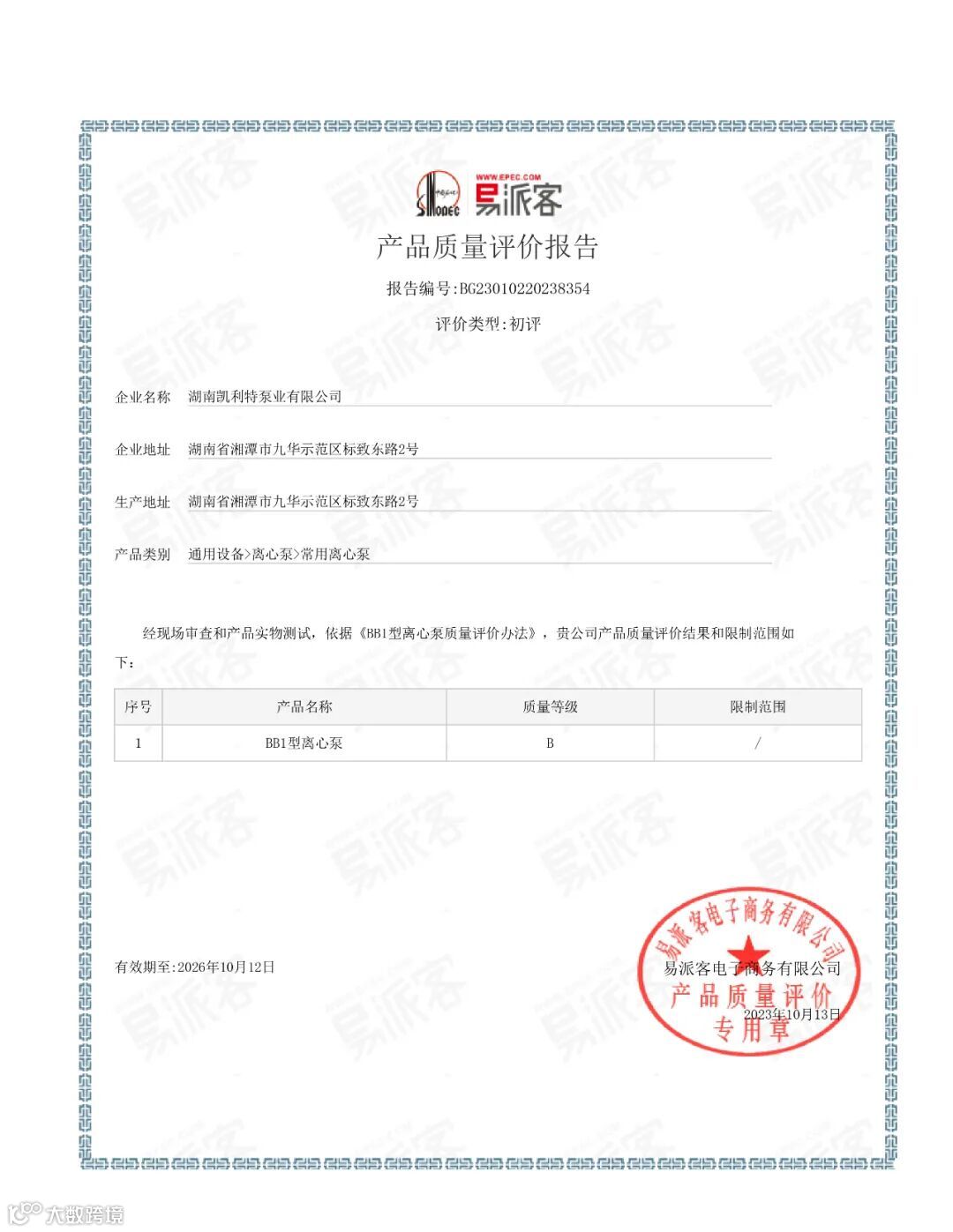 9月份,中石化易派客评定组专家对凯利特泵业石油泵产品开发能力、质量控制、生产能力、质量管理体系实施、企业综合实力等方面进行了评定,经过现场审查和产品实物测试,凯利特泵业BB1型离心泵产品质量评价等级达到B级,10月13日,中石化易派客为凯利特泵业颁发了产品质量评价报告。