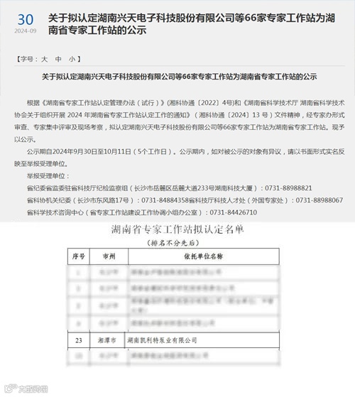 近日,根据《湖南省专家工作站认定管理办法(试行)》(湘科协通(2022〕4号)和《湖南省科学技术厅 湖南省科学技术协会关于组织开展2024年湖南省专家工作站认定工作的通知》(湘科协通〔2024〕13号)文件精神,经专家办形式审查、专家集中评审及现场考察,认定了66家湖南省专家工作站,其中湖南凯利特泵业有限公司(以下简称凯利特泵业)获评上榜,这一荣誉不仅是对凯利特泵业在科研创新、人才引进及培养方面工作的高度认可,也标志着凯利特泵业在推动地方经济和社会发展中所作出的努力得到了省级层面的支持。