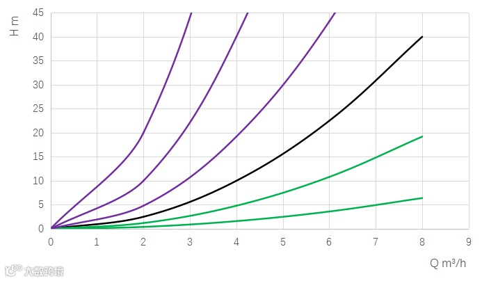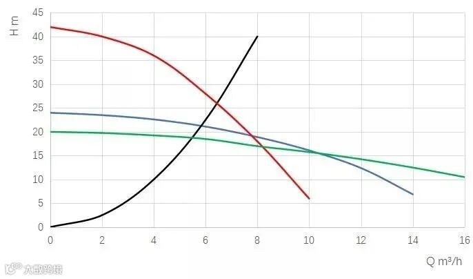 对于不变的系统阻力曲线来说,这个流量和扬程的关系是满足达西公式的,有兴趣的朋友可以自行搜索达西公式。
