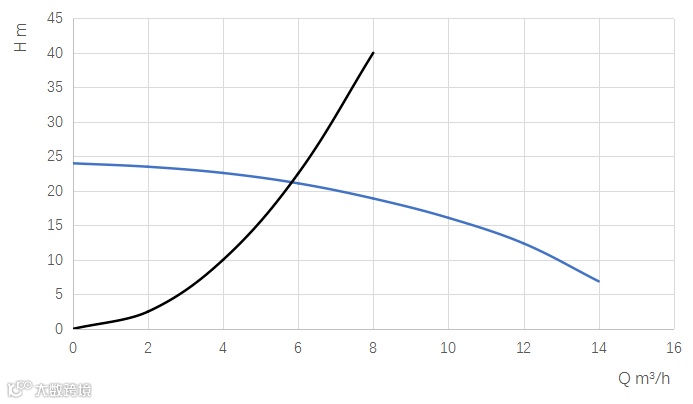 回到我们的正题,当水泵性能曲线和系统阻力曲线绘制在一个图表内时,它们的交点即为水泵的实际工作点: