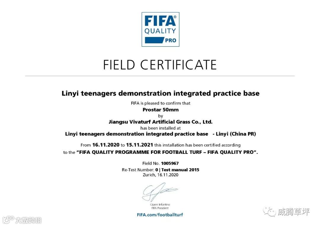 2020年11月16日,经过国际足联FIFA指定的法国LaboSport实验室的严苛验收,由江苏联创人造草坪股份有限公司铺设的临沂市青少年示范性综合实践基地足球场顺利通过国际足联(FIFA)足球场草坪质量检测,获得FIFA QUALITY PRO 认证证书!
