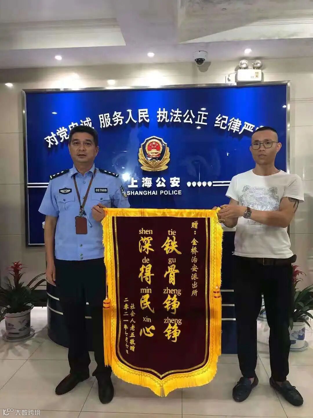 2021年7月2日中午,当事人陈某某将一面印有“公正执法 热情为民”的锦旗送到派出所,表达对民警的深切感谢!