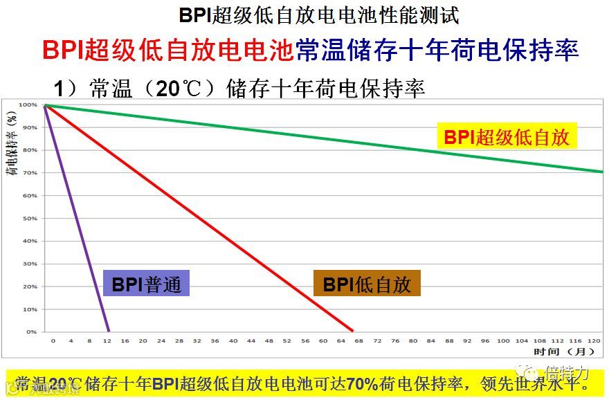 我们经过多年的不懈努力,终于研发出BPI超级低自放电电池,10年荷电达70%。