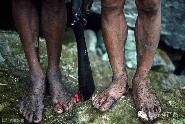 虽然全副武装,手脚裸露在外的部位还是被蜂蜜叮咬得惨不忍睹。疼?当然,但是要忍。摄影师镜头下采蜜人的脚,长期的攀爬和蜂蜜叮咬,他的脚掌已经布满老茧。