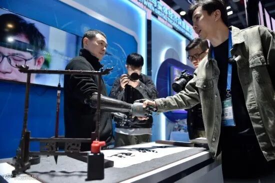 在第二届全球数字贸易博览会上,观众体验与穿戴智能仿生手的参展人员握手。新华社记者刘岭逸 摄