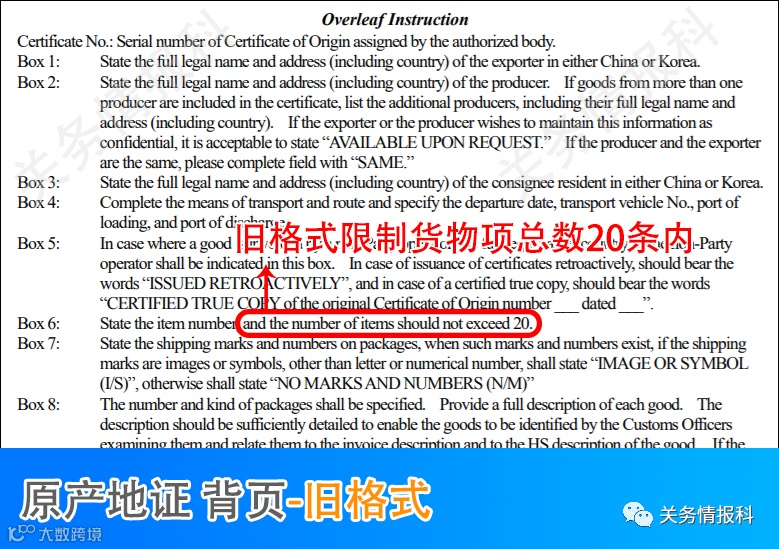 根据《中华人民共和国政府和大韩民国政府自由贸易协定》有关规定和联合委员会决议,取消该协定项下进出口货物原产地证书商品项数上限20项的限制,证书格式按照附件执行。