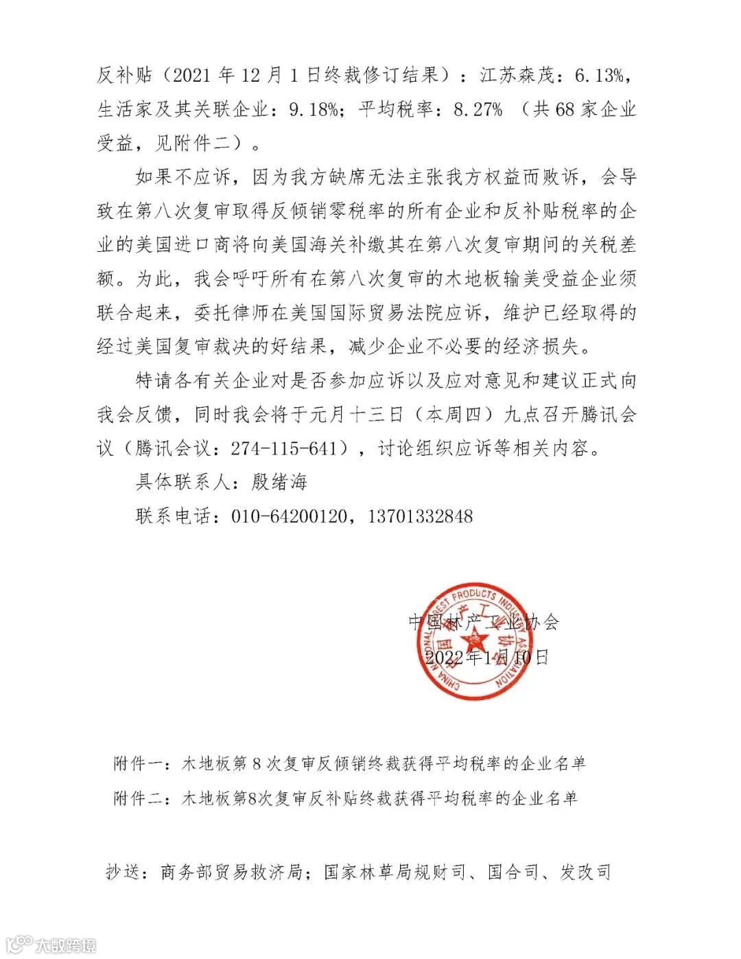 关于美对华木地板双反第八次复审结果原告上诉后应诉会议的通知