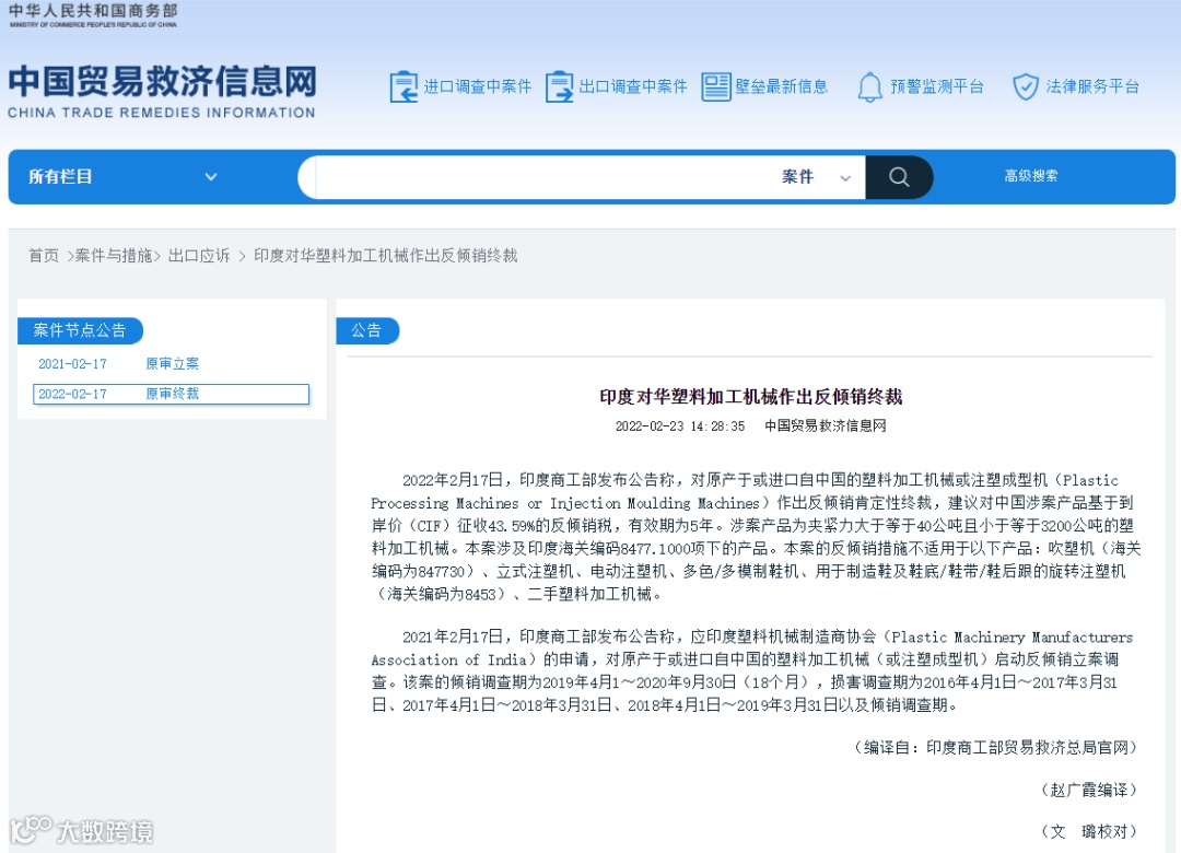 2022年2月17日,印度商工部发布公告称,对原产于或进口自中国的塑料加工机械或注塑成型机(Plastic Processing Machines or Injection Moulding Machines)作出反倾销肯定性终裁,建议对中国涉案产品基于到岸价(CIF)征收43.59%的反倾销税,有效期为5年。涉案产品为夹紧力大于等于40公吨且小于等于3200公吨的塑料加工机械。本案涉及印度海关编码8477.1000项下的产品。本案的反倾销措施不适用于以下产品:吹塑机(海关编码为847730)、立式注塑机、电动注塑机、多色/多模制鞋机、用于制造鞋及鞋底/鞋带/鞋后跟的旋转注塑机(海关编码为8453)、二手塑料加工机械。