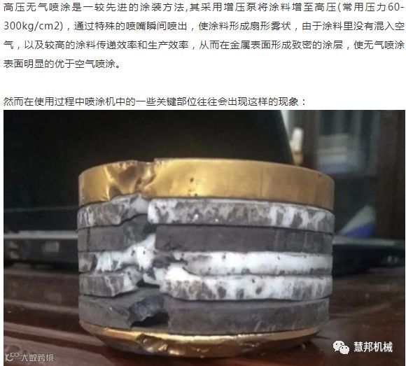 高压无气喷涂是一较先进的涂装方法,其采用增压泵将涂料增至高压(常用压力60-300kg/cm2),通过特殊的喷嘴瞬间喷出,使涂料形成扇形雾状,由于涂料里没有混入空气,以及较高的涂料传递效率和生产效率,从而在金属表面形成致密的涂层,使无气喷涂表面明显的优于空气喷涂。