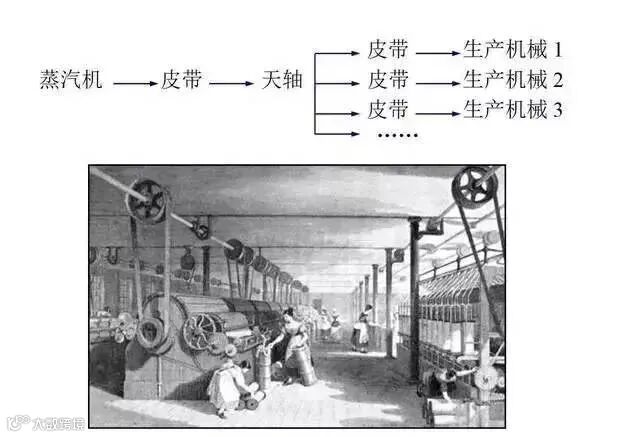 在第二次工业革命中,电动机和内燃机发明了,电取代了蒸汽。集中驱动被放弃,每台机器都配备了一台单独的电机。它为汽车和飞机的出现提供了可能。1886年,奔驰的汽油发动机驱动三轮车获得专利。