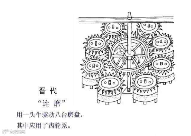 “连 磨”用一头牛驱动八台磨盘,其中应用了齿轮系。