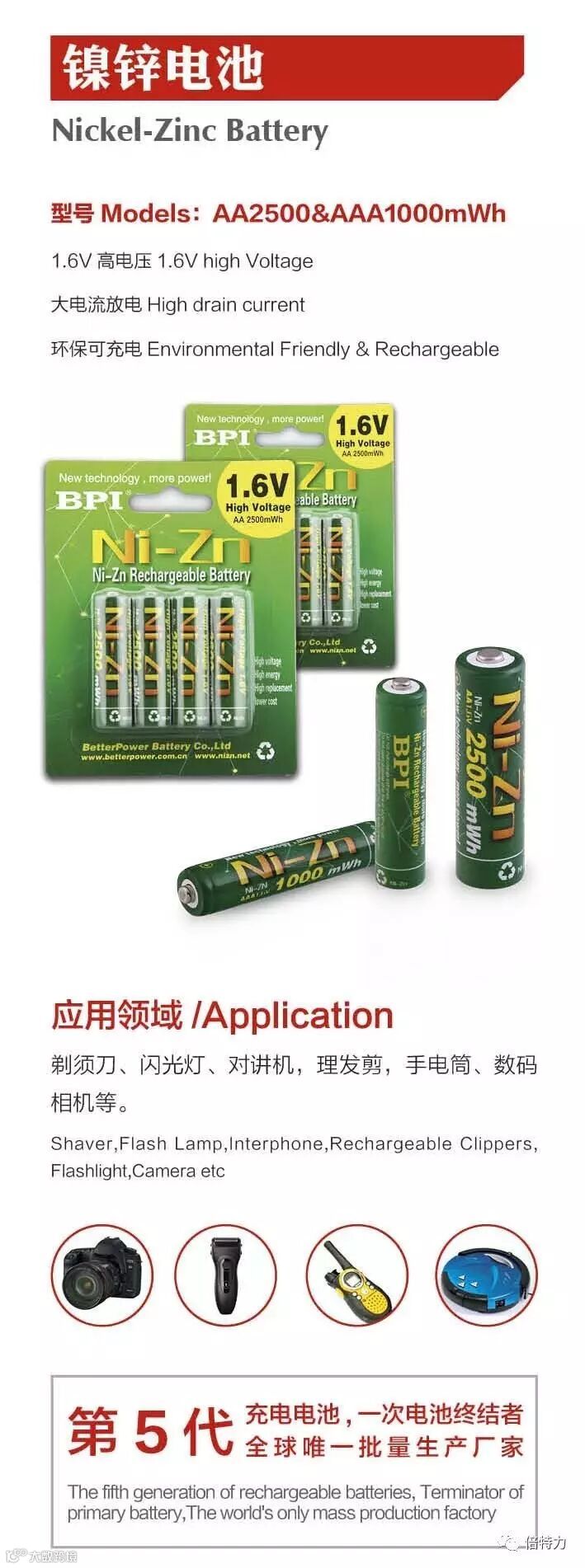 3、锌镍电池“第5代充电电池,一次电池的终结者,动力强劲,使用更长久!”