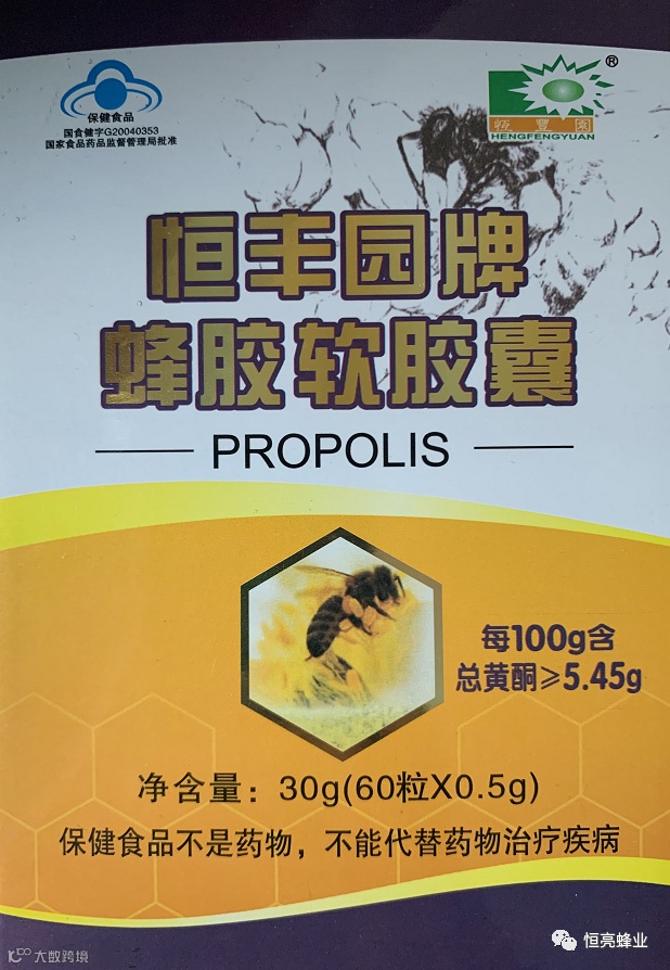 目前,大多数蜂胶产品为保健食品,您一定要认准保健食品特有的标志——蓝帽子标志,比如下图的恒丰园牌蜂胶软胶囊。