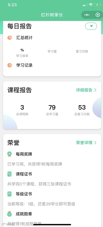 家长可通过小程序随时登录,查看孩子学习进度与效果。