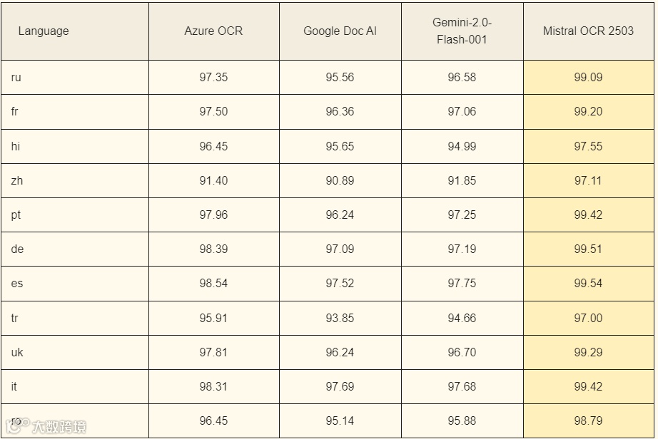 自 Mistral 成立以来,我们一直致力于用我们的模型服务世界,因此我们努力在我们的产品中实现多语言能力。Mistral OCR 将这一目标提升到了一个新水平,能够解析、理解和转录各大洲的数千种脚本、字体和语言。这种多功能性对于处理来自不同语言背景的文档的全球组织以及服务于小众市场的超本地化企业都至关重要。