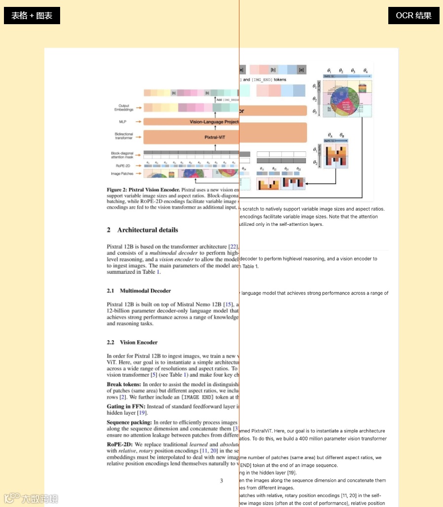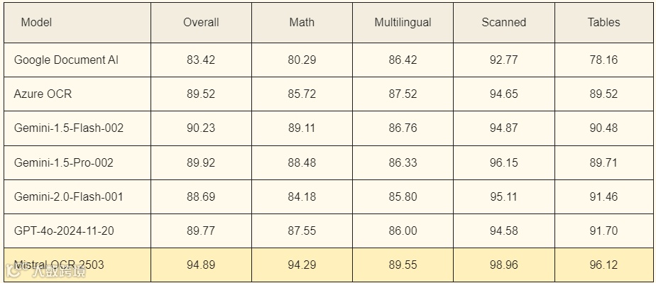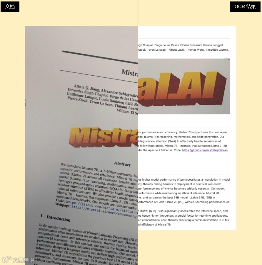 Mistral OCR 擅长理解复杂的文档元素,包括交错图像、数学表达式、表格和高级布局(如 LaTeX 格式)。该模型可以更深入地理解丰富的文档,例如包含图表、图形、方程式和数字的科学论文。
