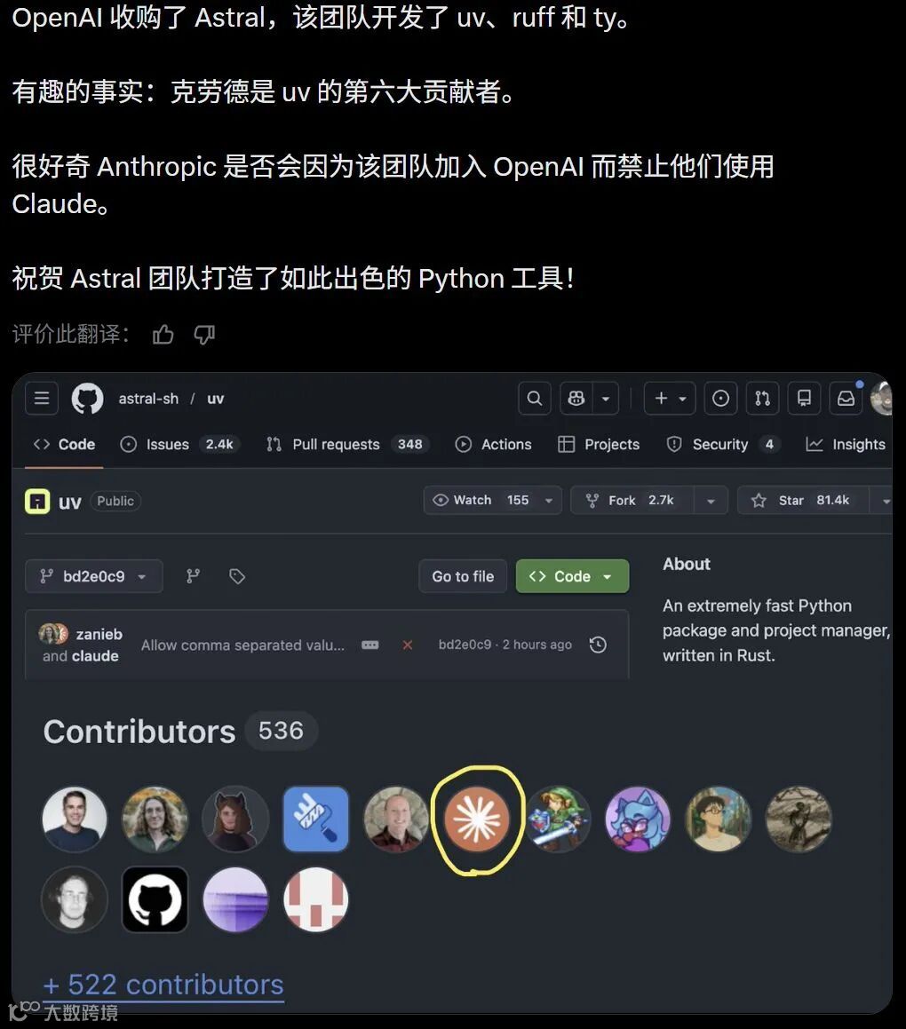 这次收购还有一个有趣的背景:Anthropic 的 Claude 已经是 Astral 项目的重要代码贡献者。