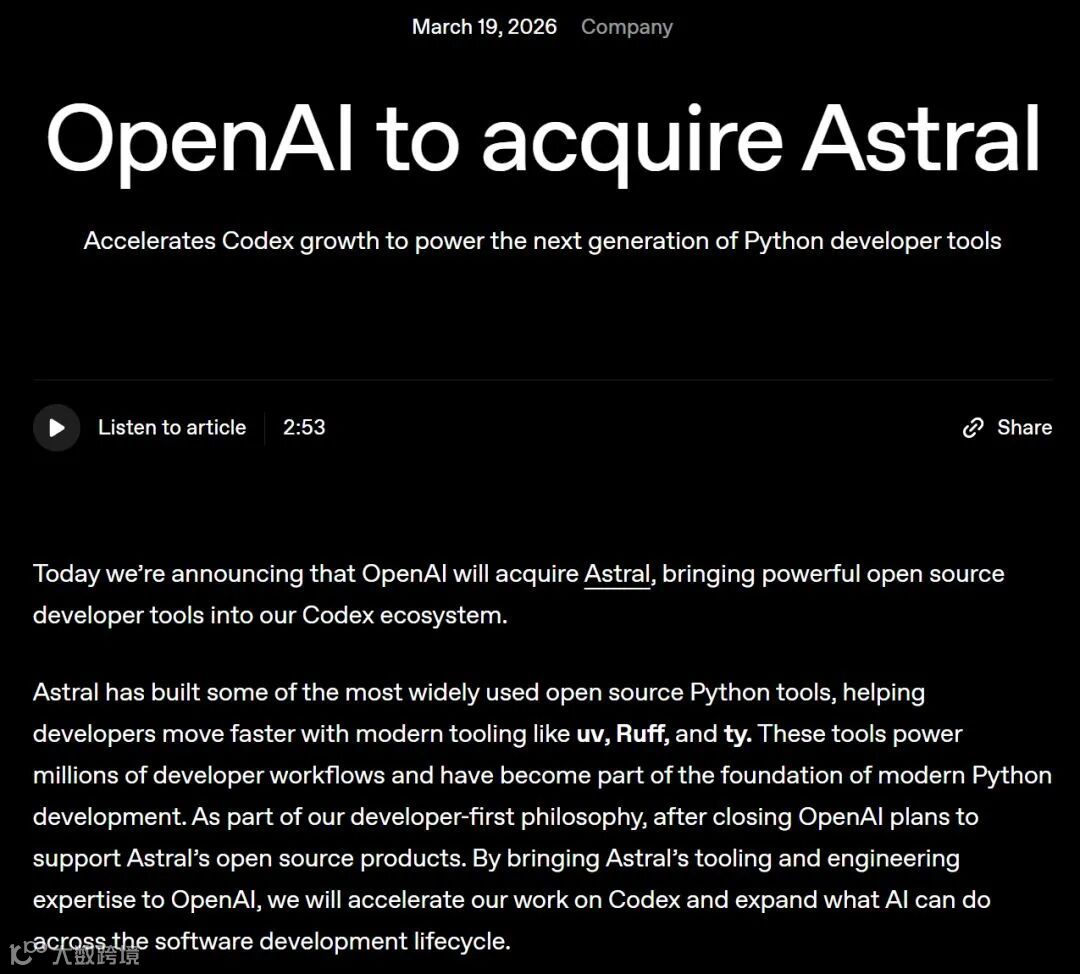 2026 年 3 月 19 日,一则消息在开发者社区炸开了锅——OpenAI 宣布收购 Astral,这家专注于 Python 开发工具的明星初创公司。交易完成后,Astral 团队将全部并入 OpenAI 的 Codex 团队。