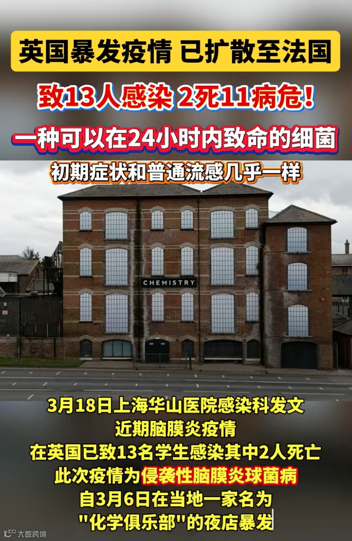 死者为一名21岁大学生与一名18岁高中生,当地5所学校出现确诊或疑似病例,数百人接受紧急预防性抗生素治疗。英国卫生安全局已联系逾3万人开展排查,呼吁3月5日至7日到访相关夜店人员立即服药。