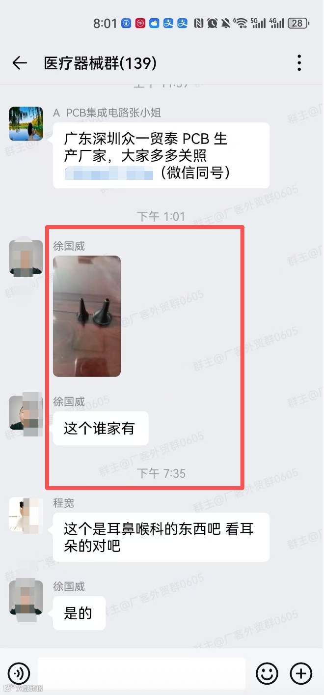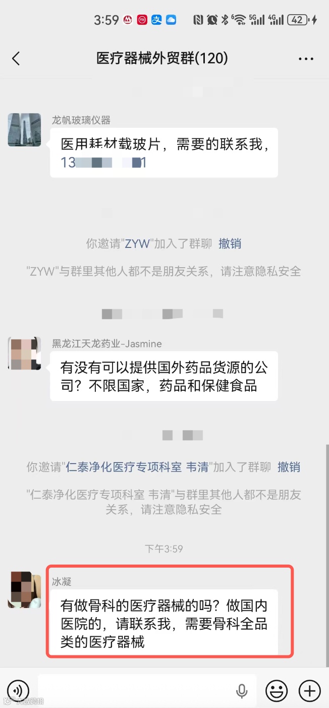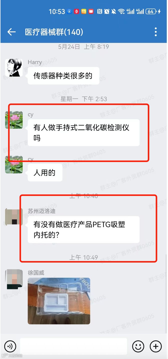 医疗器械交流群,现有两个群,一个群现有140多人,另一个有110多人,有采销需要的外贸人可以加入!群里可以发布的信息:外贸采购信息、产品销售信息,文字、图片、视频都可以,控制广告频率,不能刷屏广告。