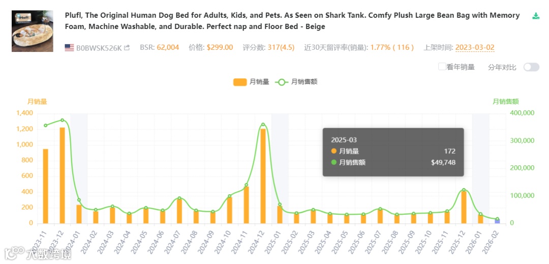 以亚马逊美国站为例,下图所示产品为一种“地板枕”,review:300+,客单价299美金,月销量100+,月销售额3w+美元