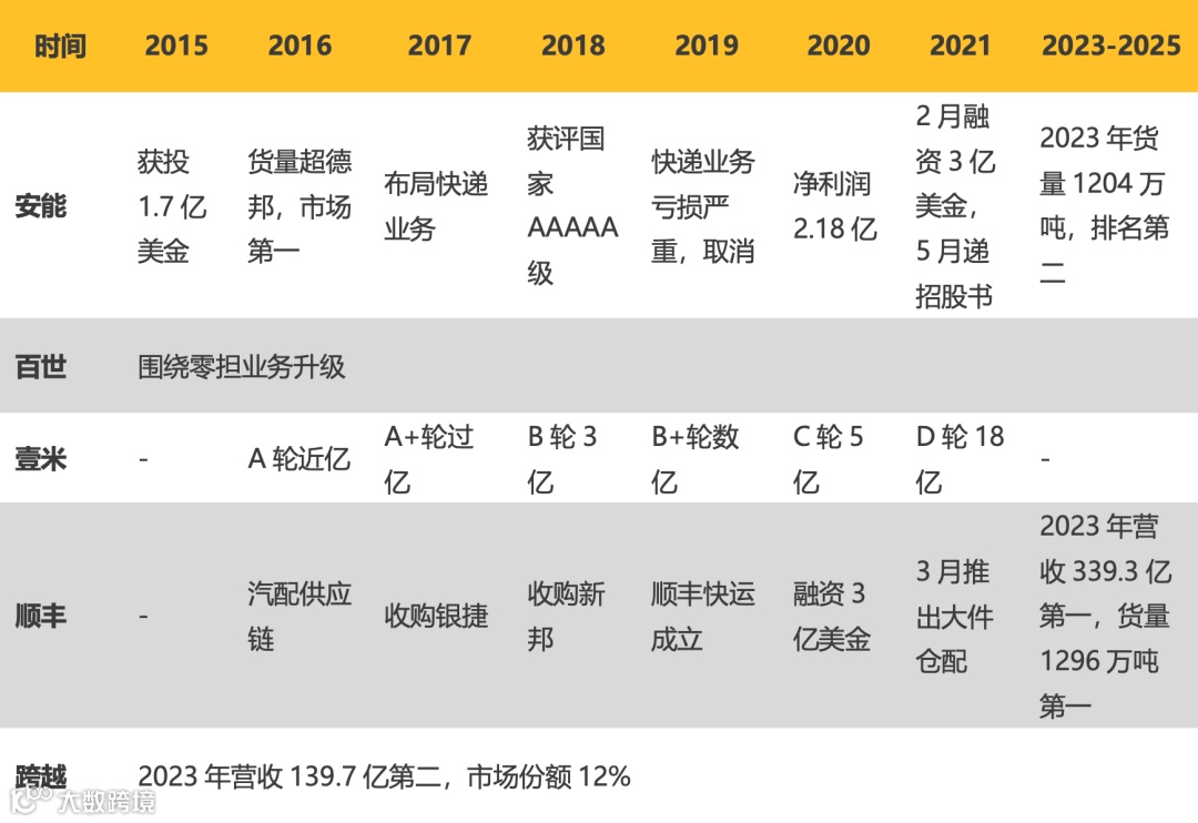 - 跨越速运:直营模式主打时效,2023年营收139.7亿元,市场份额12%,排名第二,货量不及安能、中通,但营收领先。