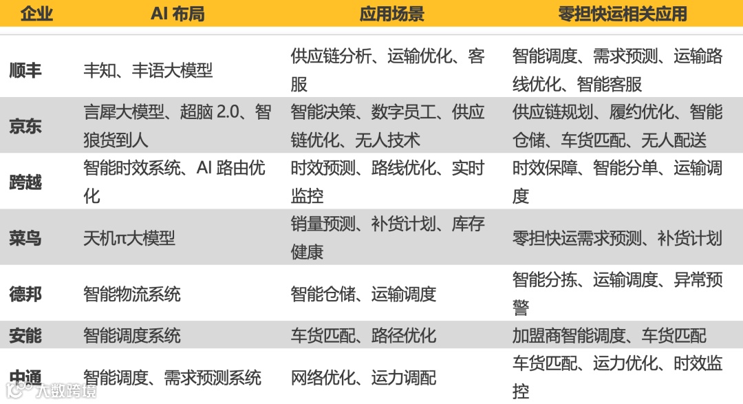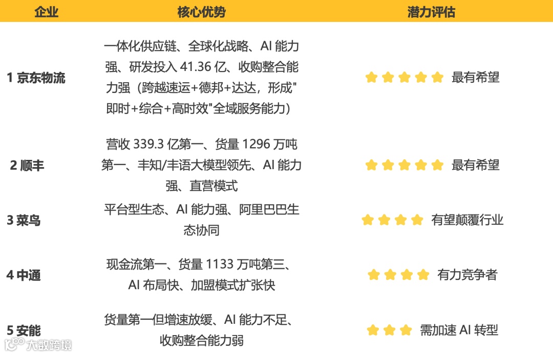 - 安能面临挑战:货量领先但AI能力滞后,增速放缓,排名下滑;