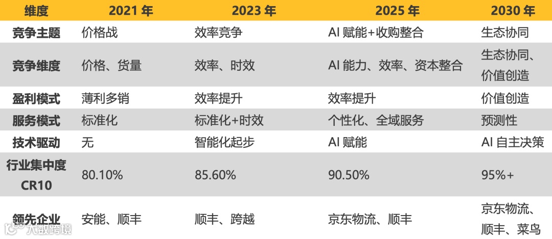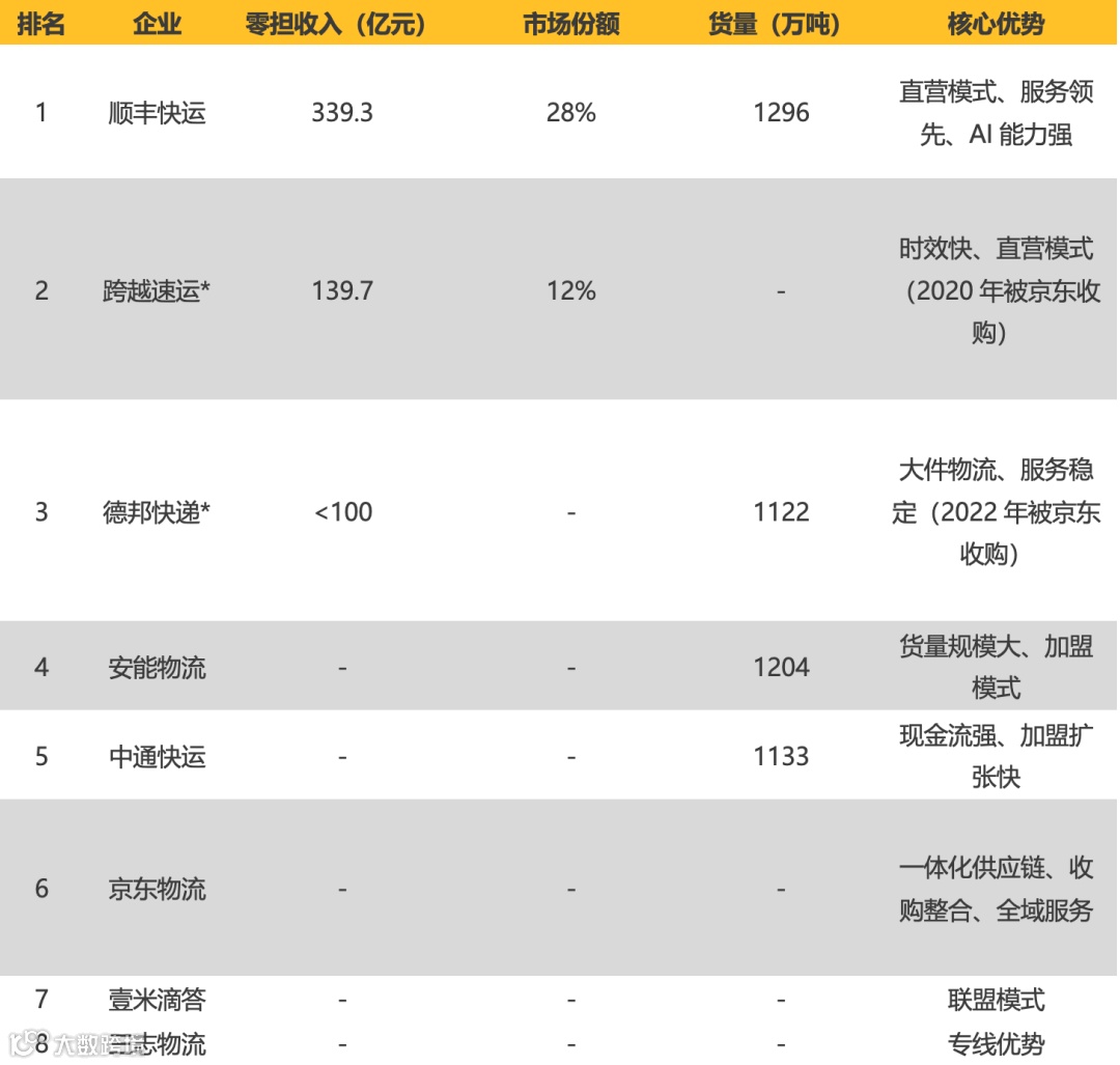 *注:跨越速运、德邦已并入京东物流,不参与独立排名;菜鸟为平台型玩家,不计入综合排名。