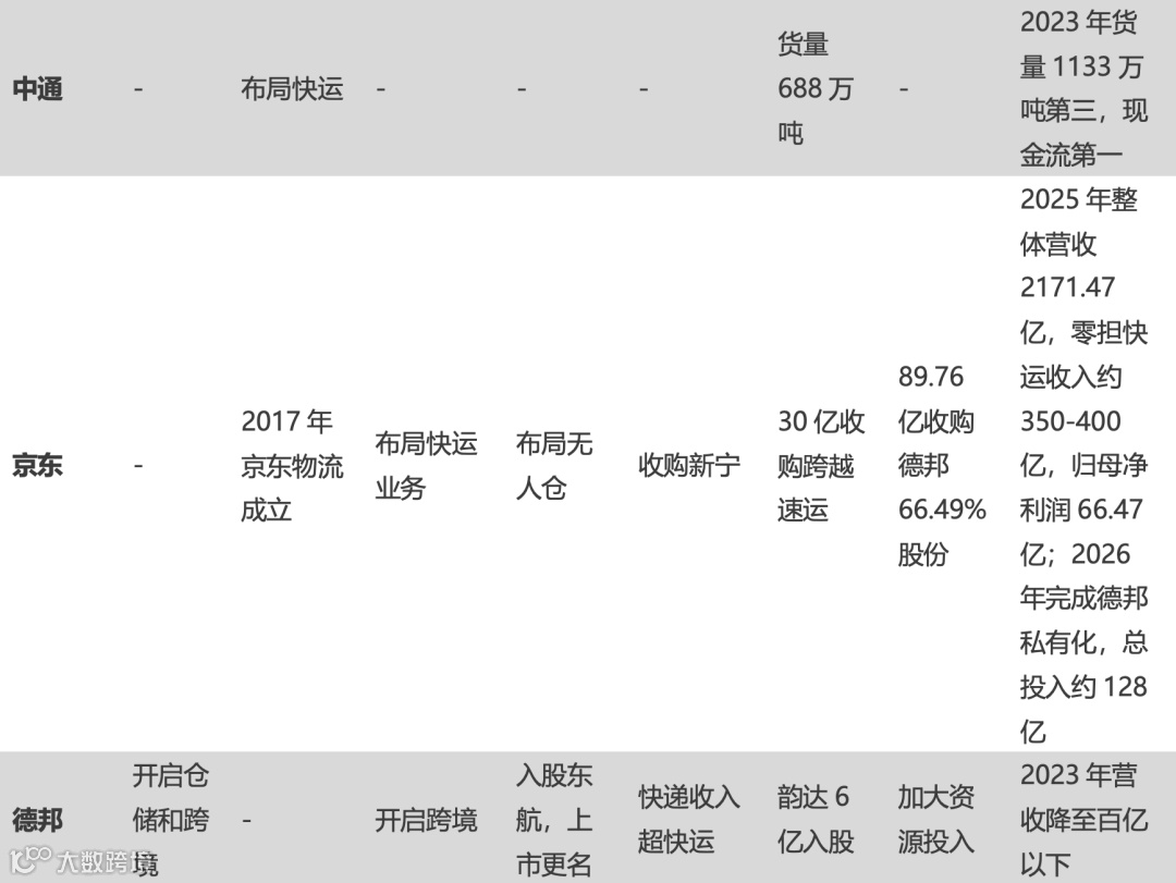 - 韵达:2017年入局,2020年斥资6亿元入股德邦,目前位列第七;