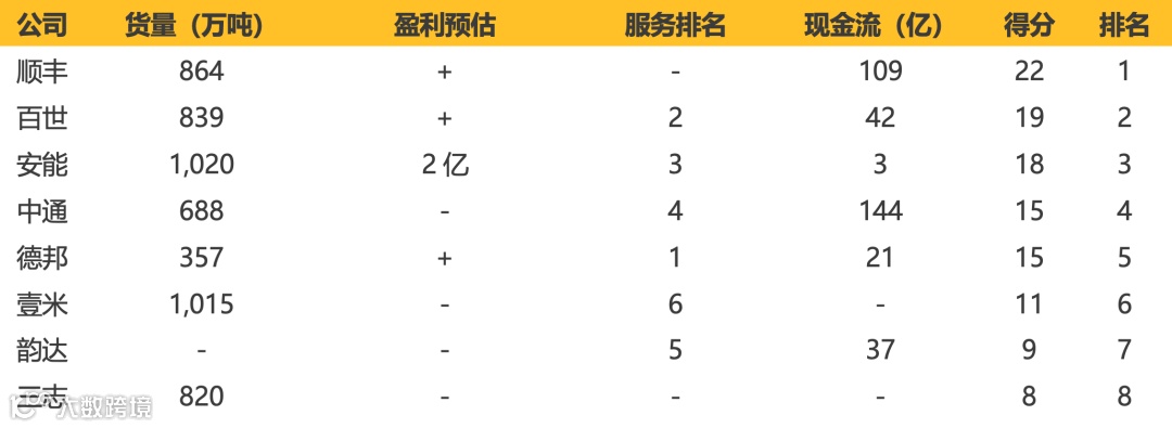 2021年竞争力评分前三:顺丰、百世、安能。