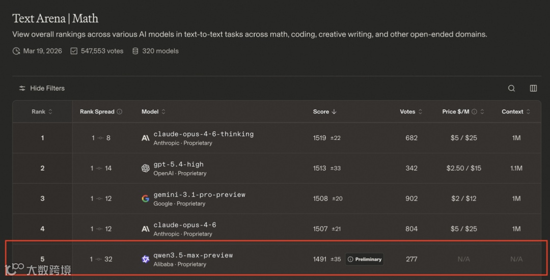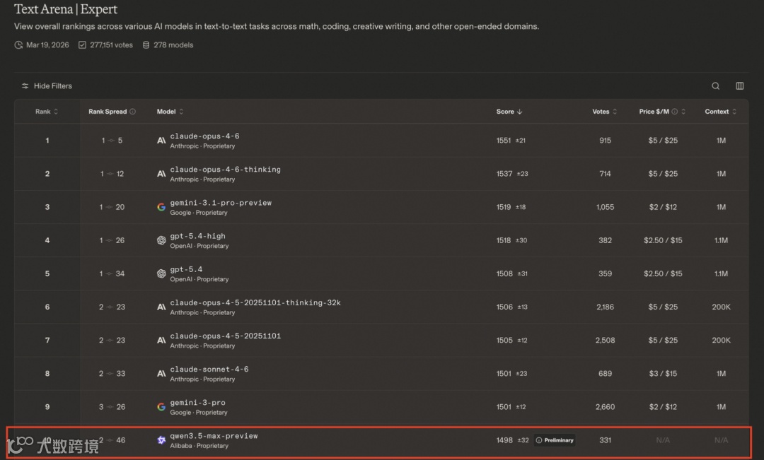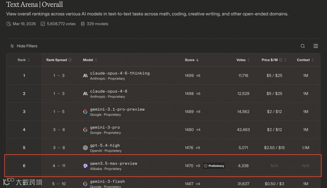 最新榜单中,阿里巴巴旗舰模型Qwen3.5-Max-Preview首次参评即获1464分。