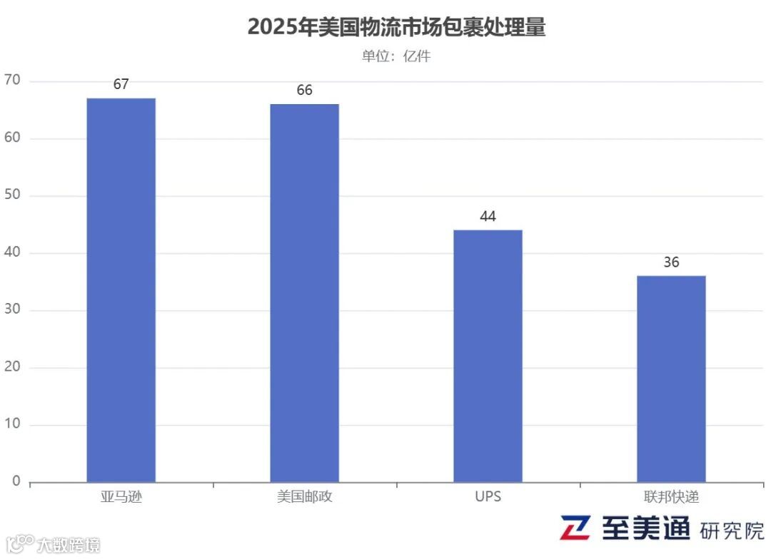 2025年,亚马逊处理包裹67亿件,同比增长9.8%,超越美国邮政(66亿件,下降8.3%),成为美国最大国内包裹承运商。UPS包裹量下降8.3%至44亿件,联邦快递增长5.9%至36亿件。亚马逊的增长不仅源于自身电商平台,还包括与外部第三方签订的运输合同。