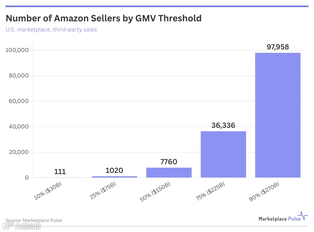 Marketplace Pulse最新数据显示,亚马逊美国站约50万活跃第三方卖家中,交易格局极度失衡: